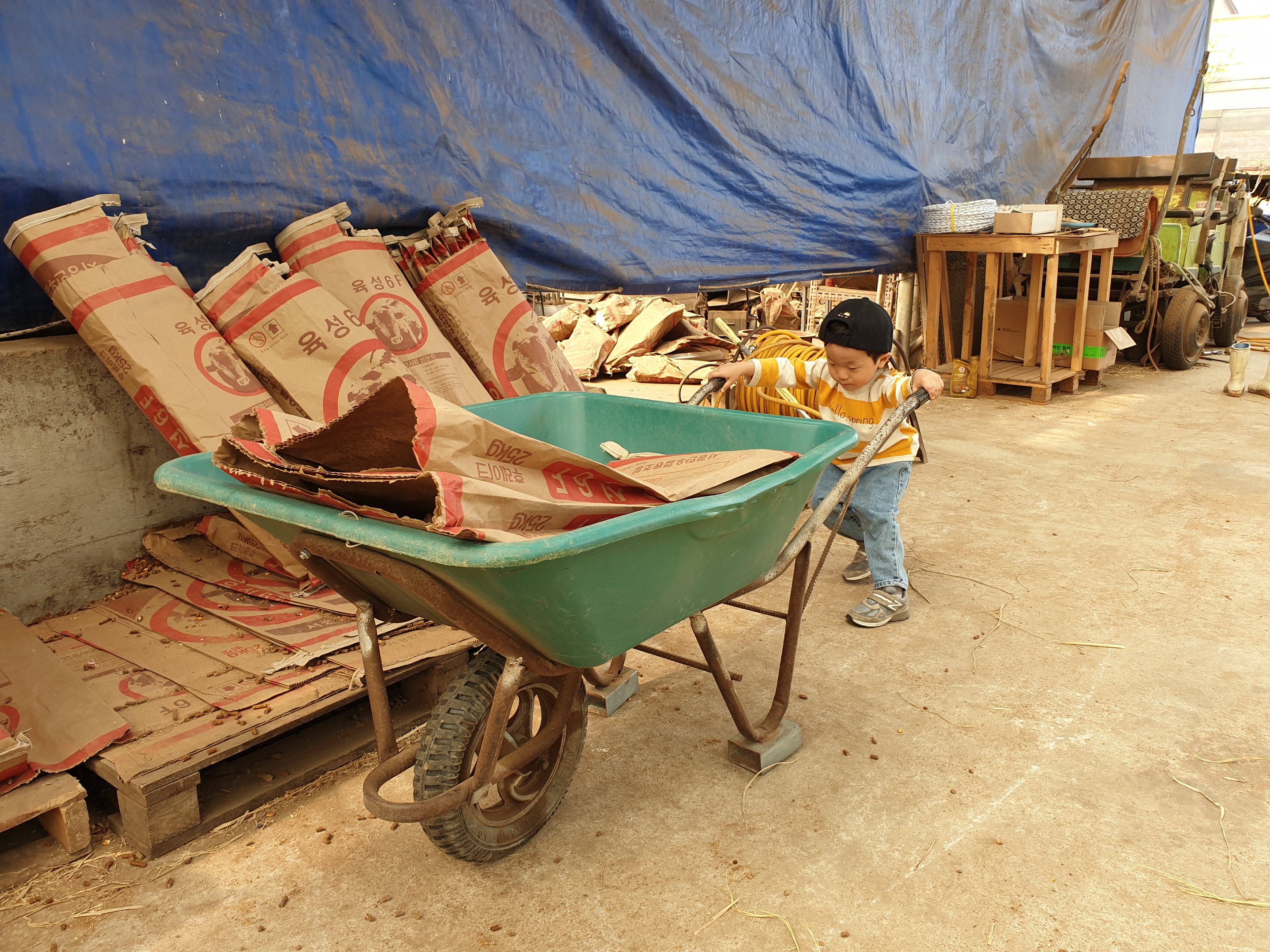 처음에는 무서워서 아빠보고 밥주고 자기는 밥을 옮기겠다며 수레를 끌려고 했는데요.