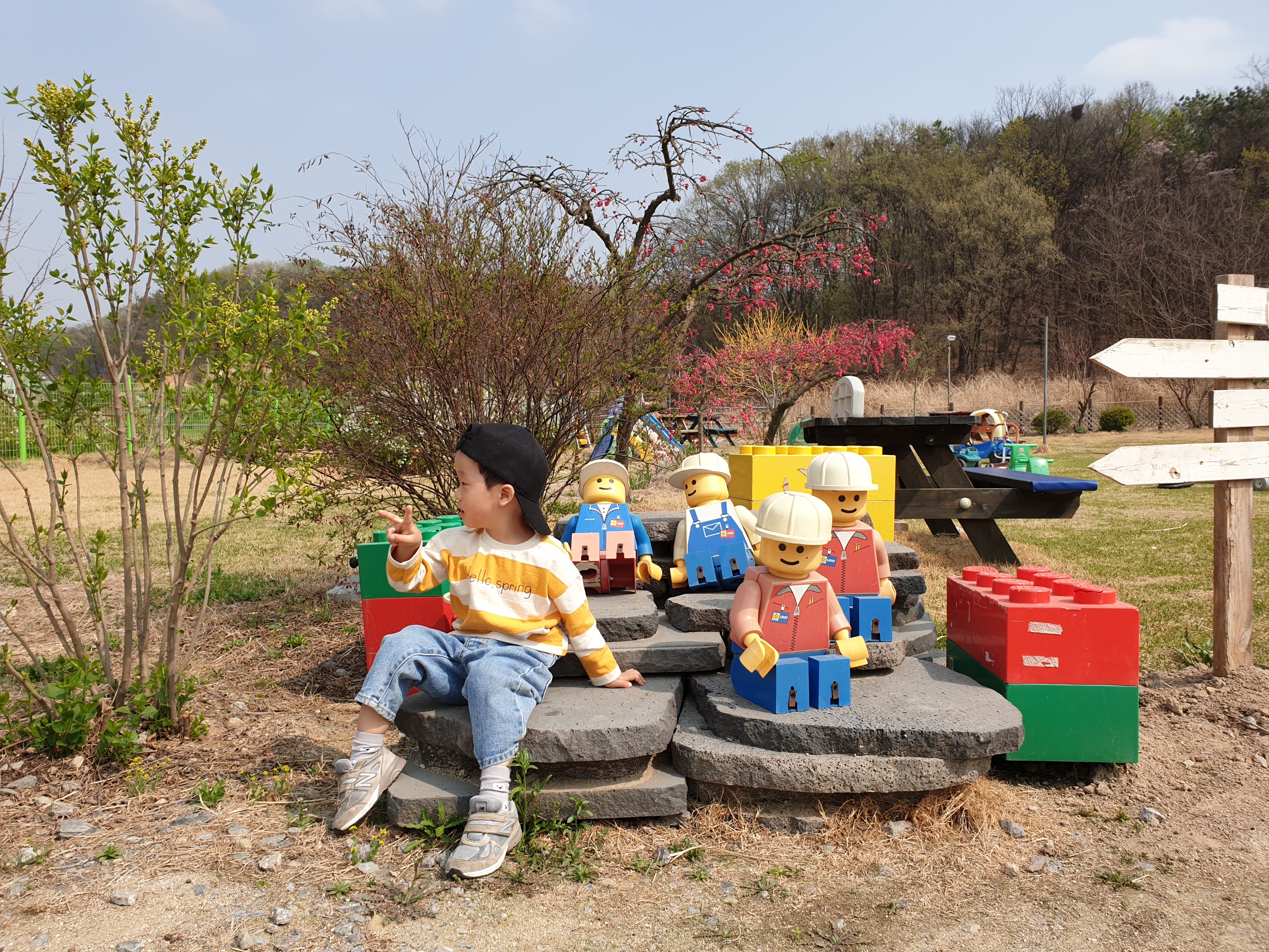 앞으로는 놀이터, 우측으로는 당나귀 농장 그리고 왼쪽으로 가시면 화장실과 휴게실이 있어요.