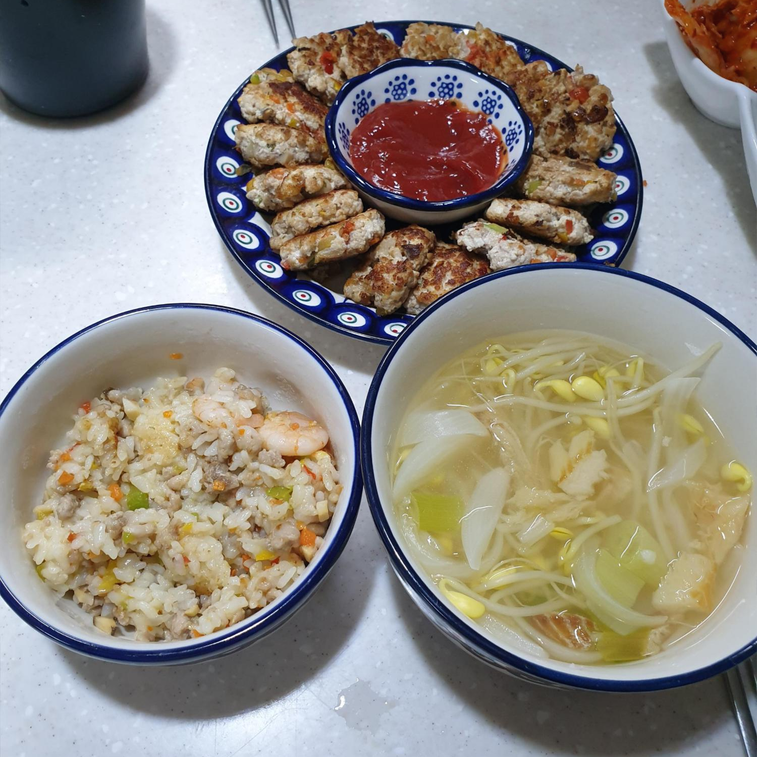 열심히 볶아주었는데요. 물론 저희가 아는 볶음밥보다는 조금 더 찰진 느낌입니다. 그래도 야채도 듬뿍 고기와 새우까지 들어가서 건강한 한 끼 식사로 충분한 새우볶음밥이 만들어졌답니다. 야채를 잔뜩 다져서 고기랑 두부를 으깨서 고기완자도 만들어봤고요. 콩나물국과 먹으니 가짜 요리사의 근본 없는 새우볶음밥이긴 하지만 충분히 맛은 있었답니다. 그리고 가족 모두 맛있는 한끼 식사를 즐겁게 했죠.