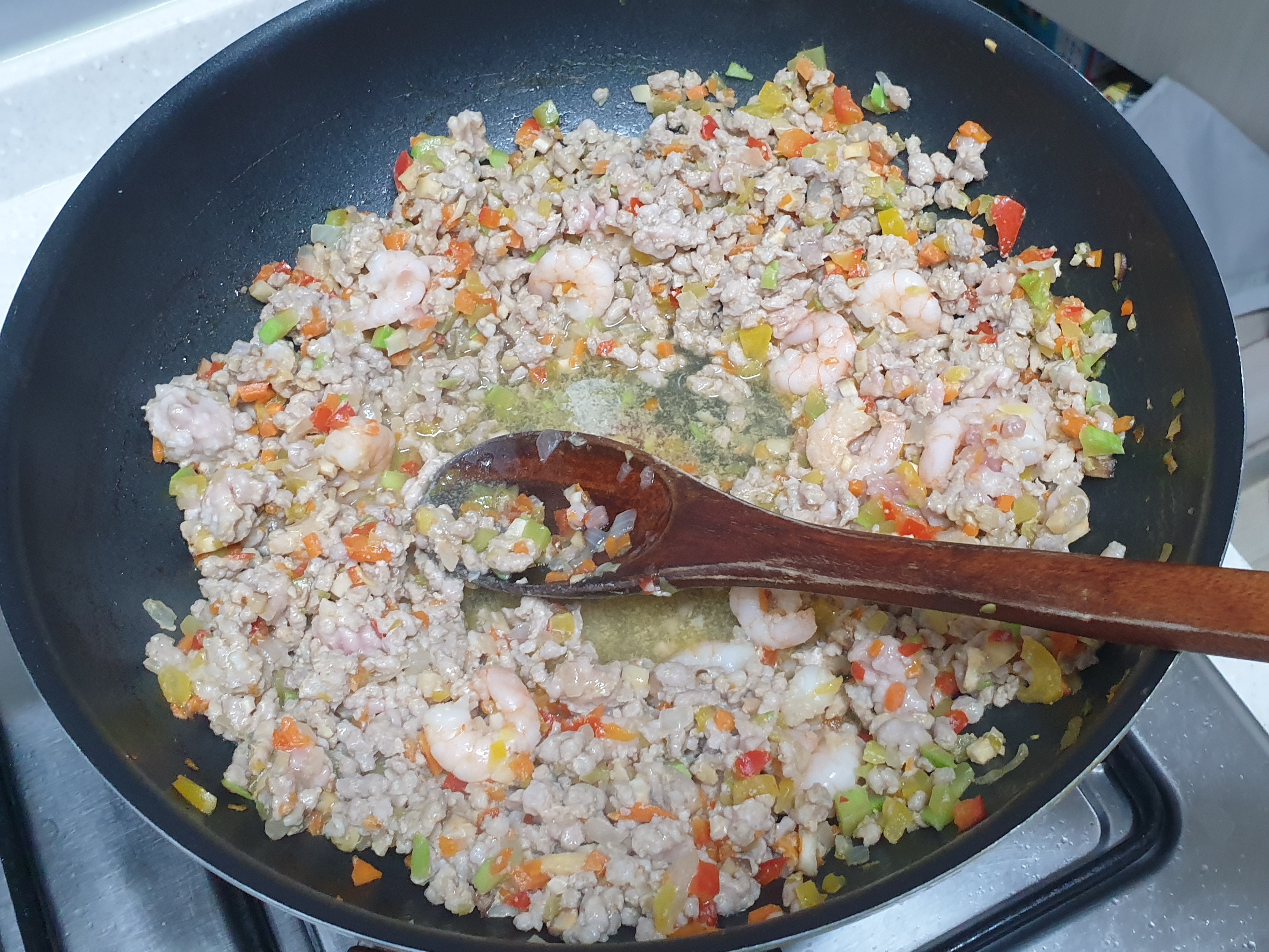 2) 기름을 두르고 센 불에 다진 야채를 볶은 후 다진 고기와 새우와 함께 다시 볶아줍니다. 간도 함께 맞춰 주세요.
