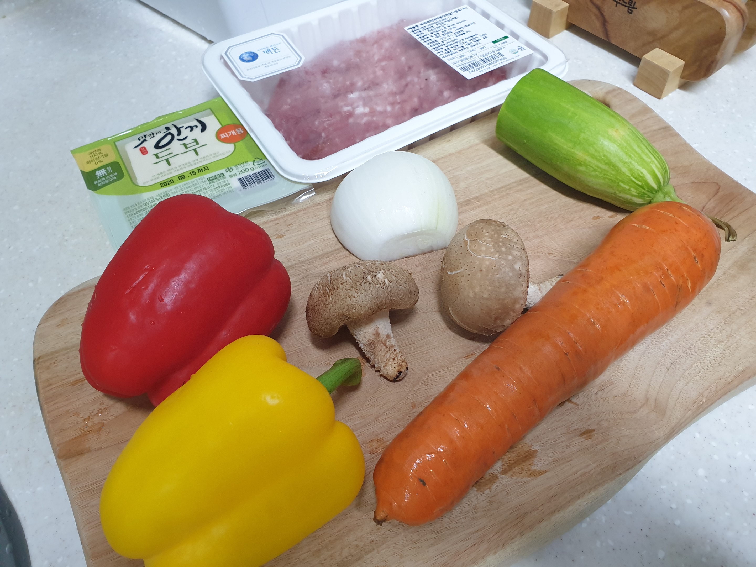 <recipe> 파프리카, 양파, 애호박, 표고버섯, 당근, 다진고기, 두부, 소금, 파슬리가루, 후추