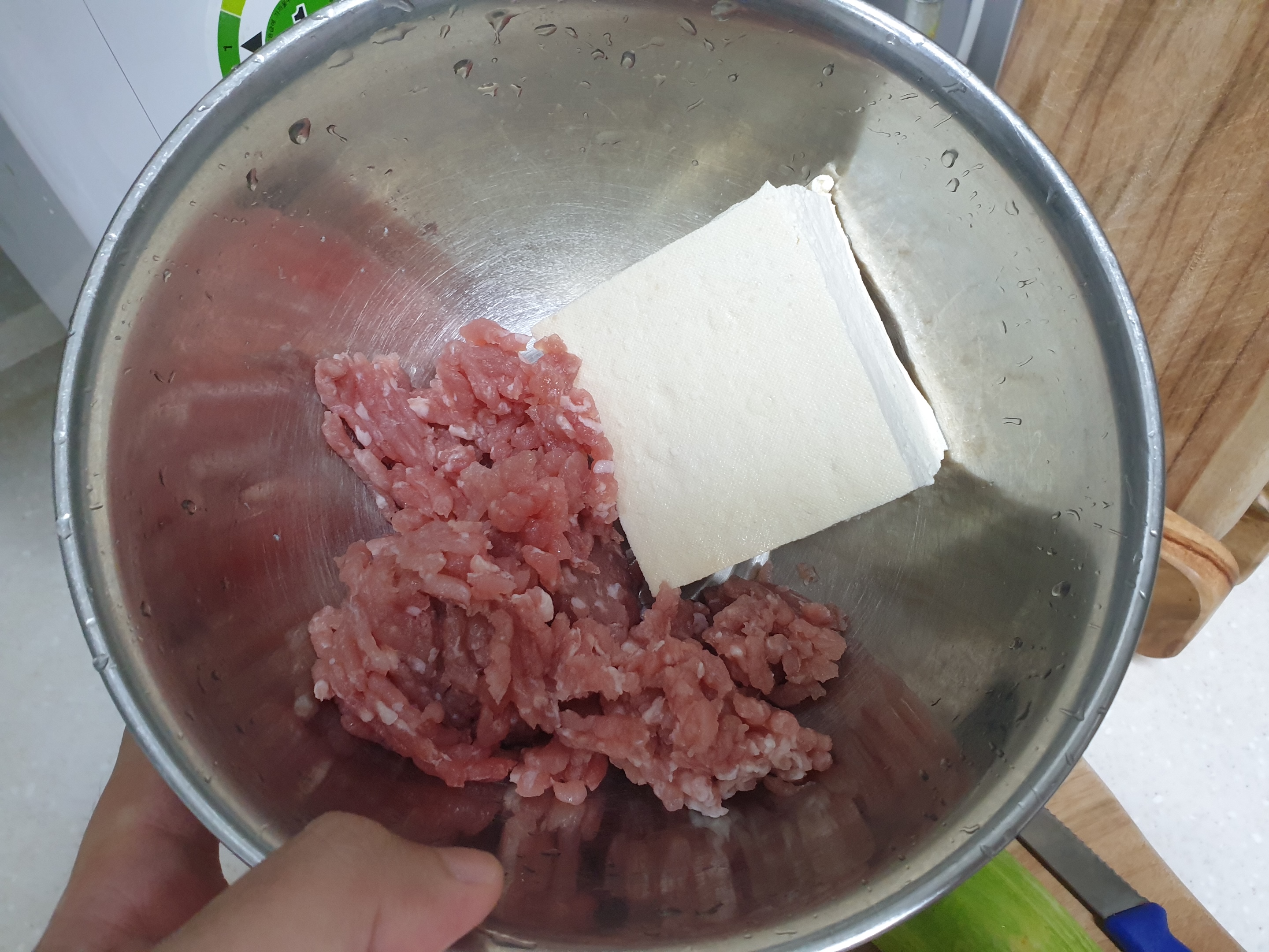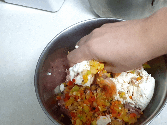 2) 볶은 야채와 두부, 다진 고기를 넣고 밑간(후추/소금/파슬리가루 등)을 해서 반죽을 만들어 줍니다.