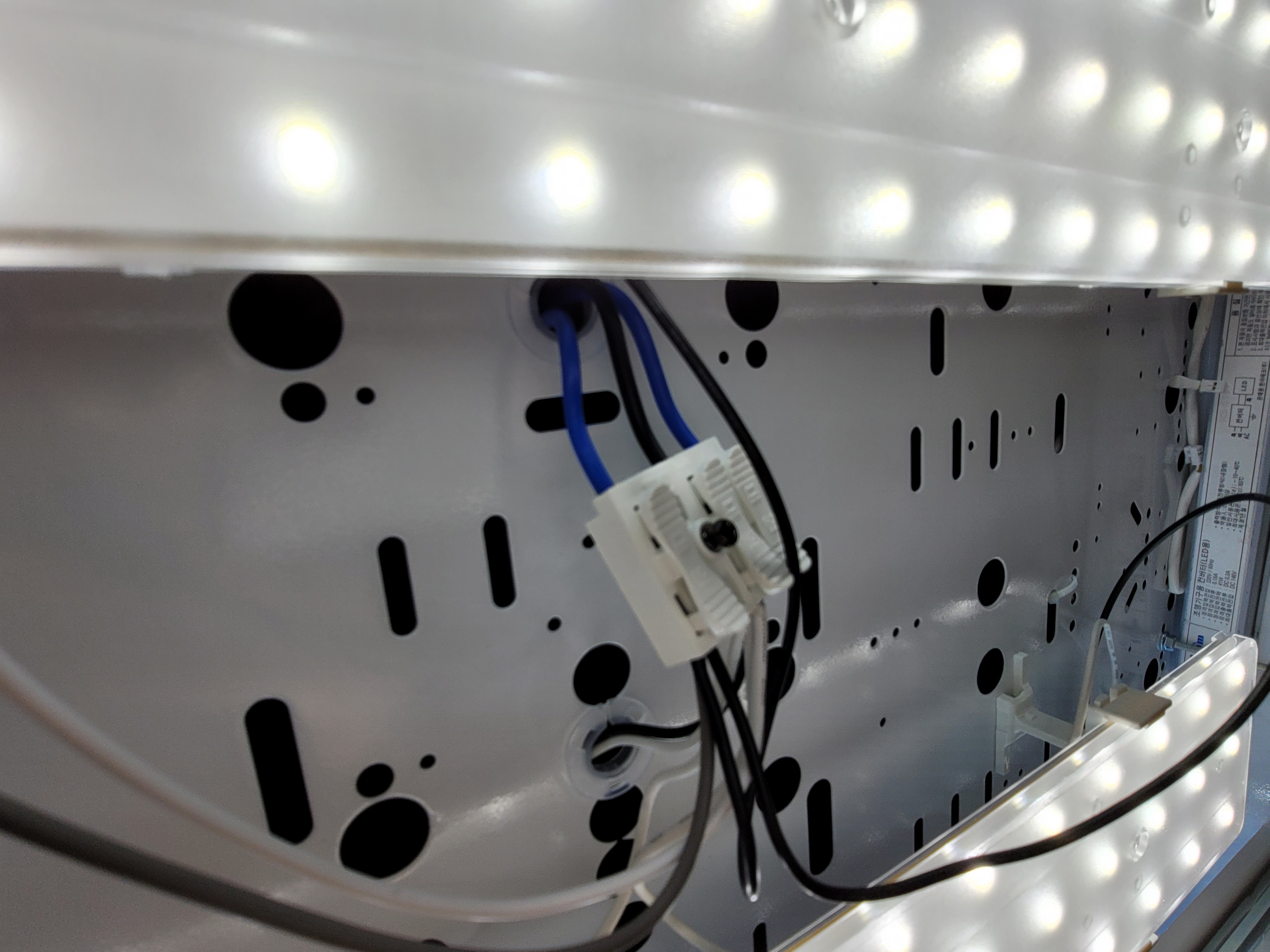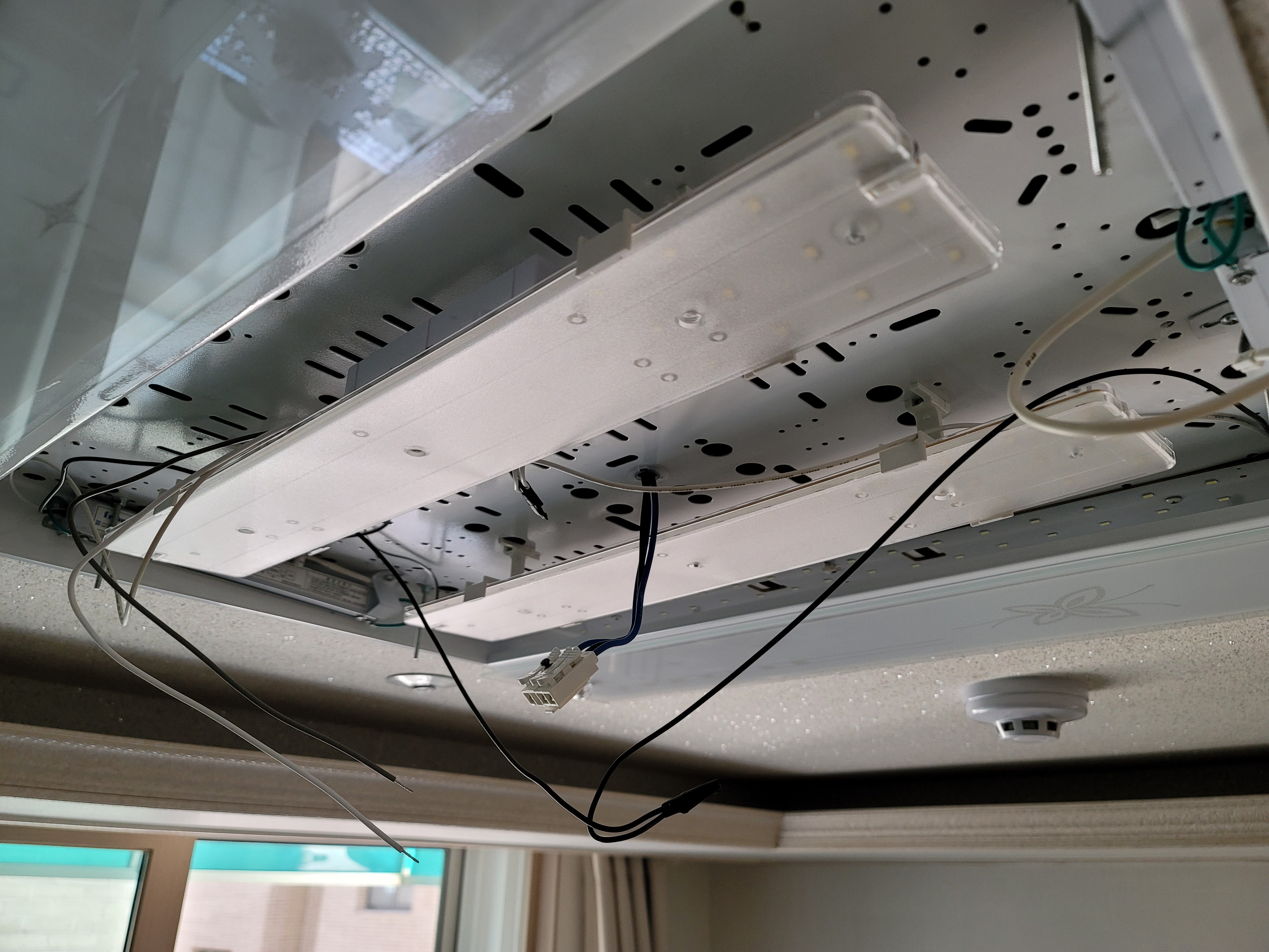 일단 기존 거실 LED 모듈을 해체해주었습니다. 모듈 해체는 어렵지 않습니다. 두꺼비집을 먼저 내려주시고요. 모서리에 잠긴 피스를 풀어주세요. 저희 LED 모듈은 접지선들을 모두 제거해야지 LED 모듈을 뺄 수가 있어서 접지선을 모두 빼주었습니다. 그리고 안정기와 연결된 선까지 분리하면 끝납니다.
