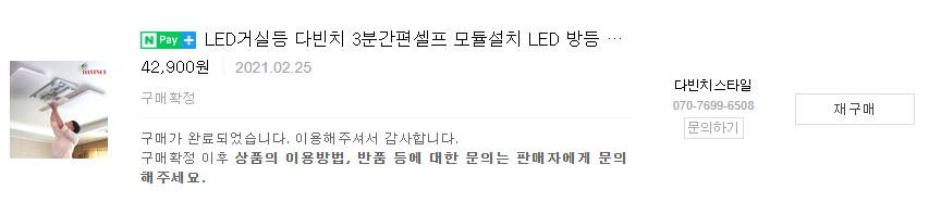 LED 모듈은 보통 반영구적으로 활용 가능하다고 합니다. 다만 반영구는 영구가 아니더라고요. 5년만에 주방등이 나가고 6년만에 거실 메인등이 나갔습니다. 매번 교체 비용도 만만치 않기 때문에 셀프 교체를 배워보았습니다. 저희와 같이 등이 깜빡일 때는 안정기를 교체하면 된다고도 하는데요. 문과 아빠는 안정기를 교체했는데 수리가 안되어서 모듈을 다시 교체해야하면 어떻게 하나 고민에 빠집니다. 그러다가 결정한 것은 모듈과 안정기가 일체형으로 나오는 다빈치LED 제품을 구매하는 것이었습니다. 홍보성 포스팅처럼 보일지 몰라서 실제 구매 내역도 첨부해보았습니다. 거실 사이즈에 맞는 모듈을 며칠 찾아보다가 결정하게 되었는데요. 앞 서 말한 것처럼 안정기 일체형으로 설치가 간편하다는 크나큰 장점이 있기 때문에 구매를 결정하게 되었죠.