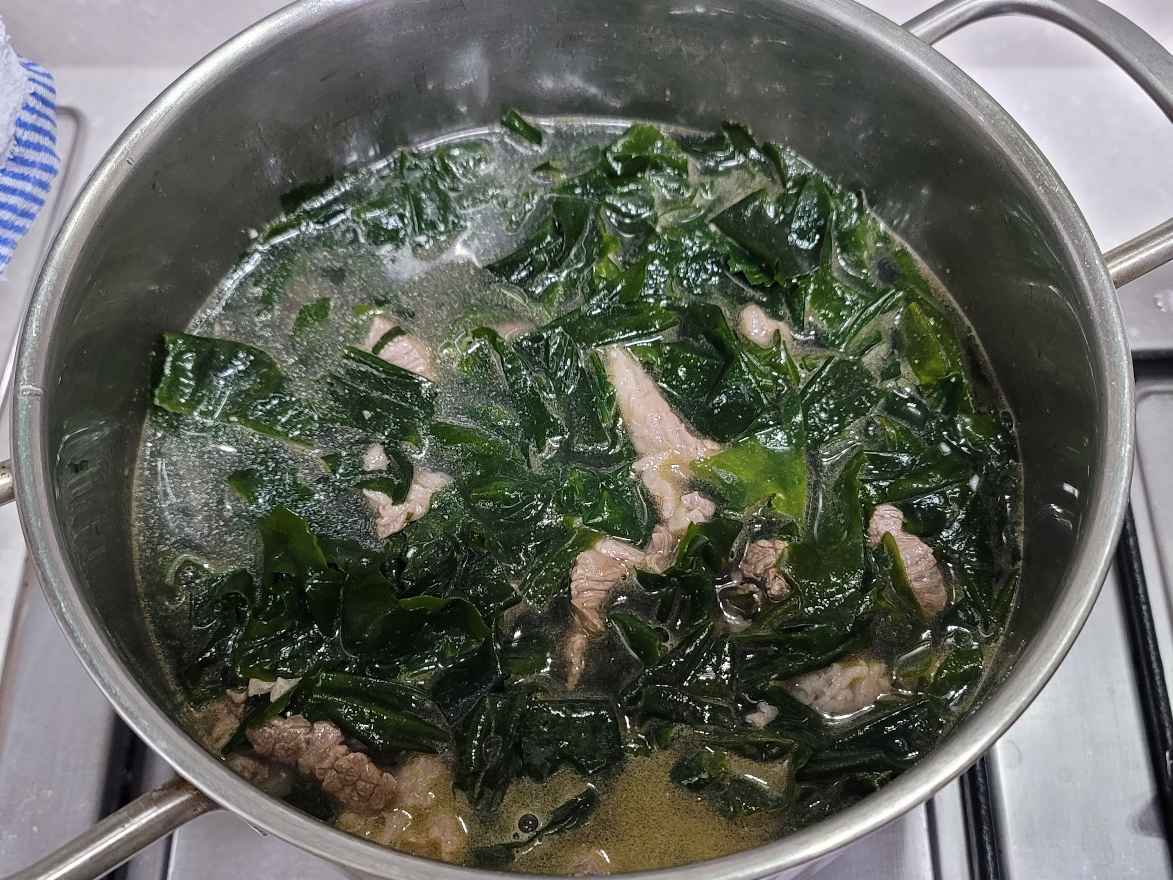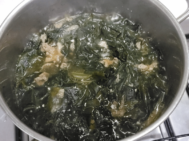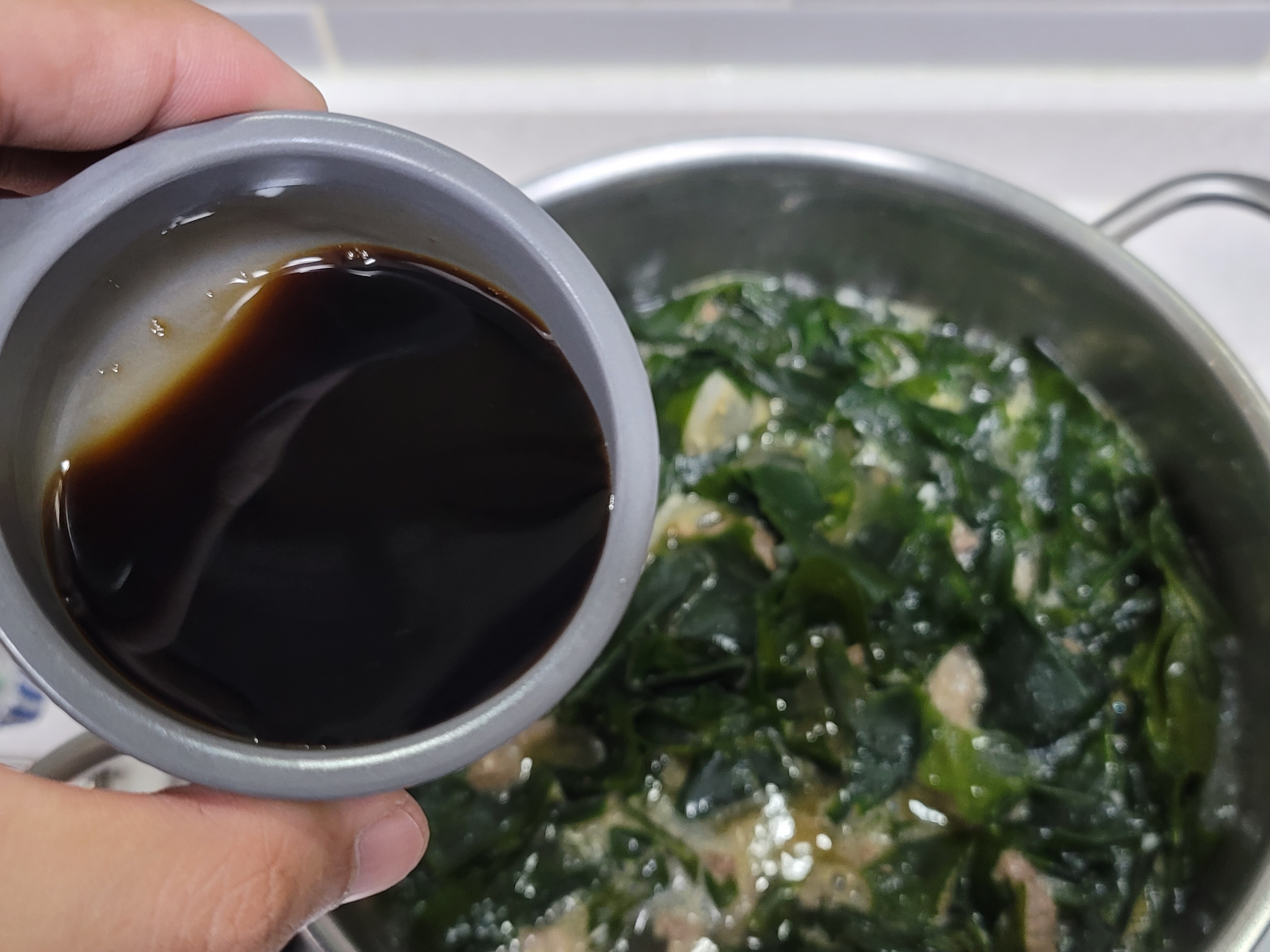 3) 불린 미역과 물을 넣고 팔팔 끓여줍니다. 국간장으로 색을 내고 마무리 간은 소금으로 해주세요.