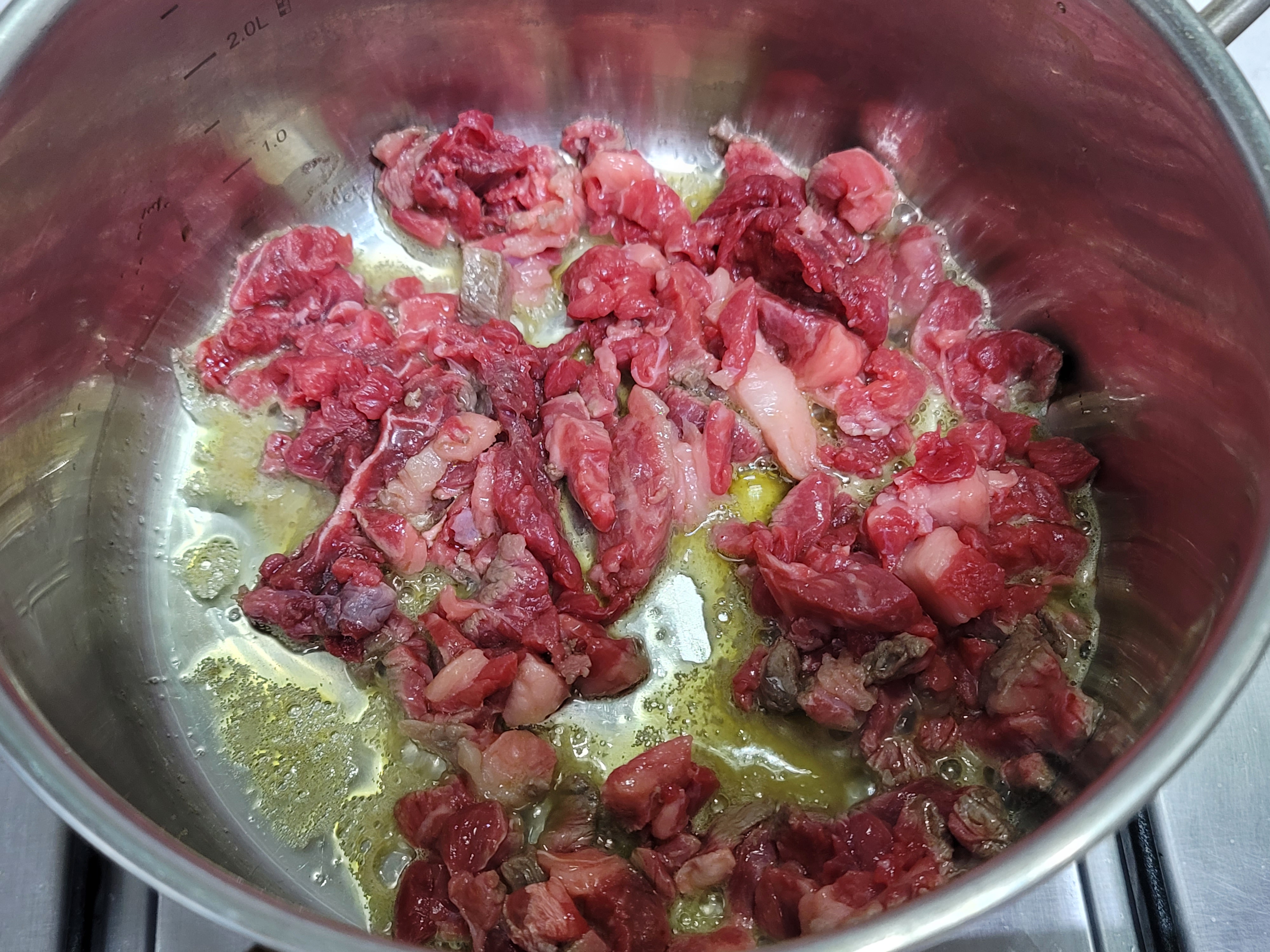 2) 핏물을 제거한 소고기는 들기름에 볶아줍니다. 적당히 볶다가 간마늘을 넣고 80% 익혀줍니다.