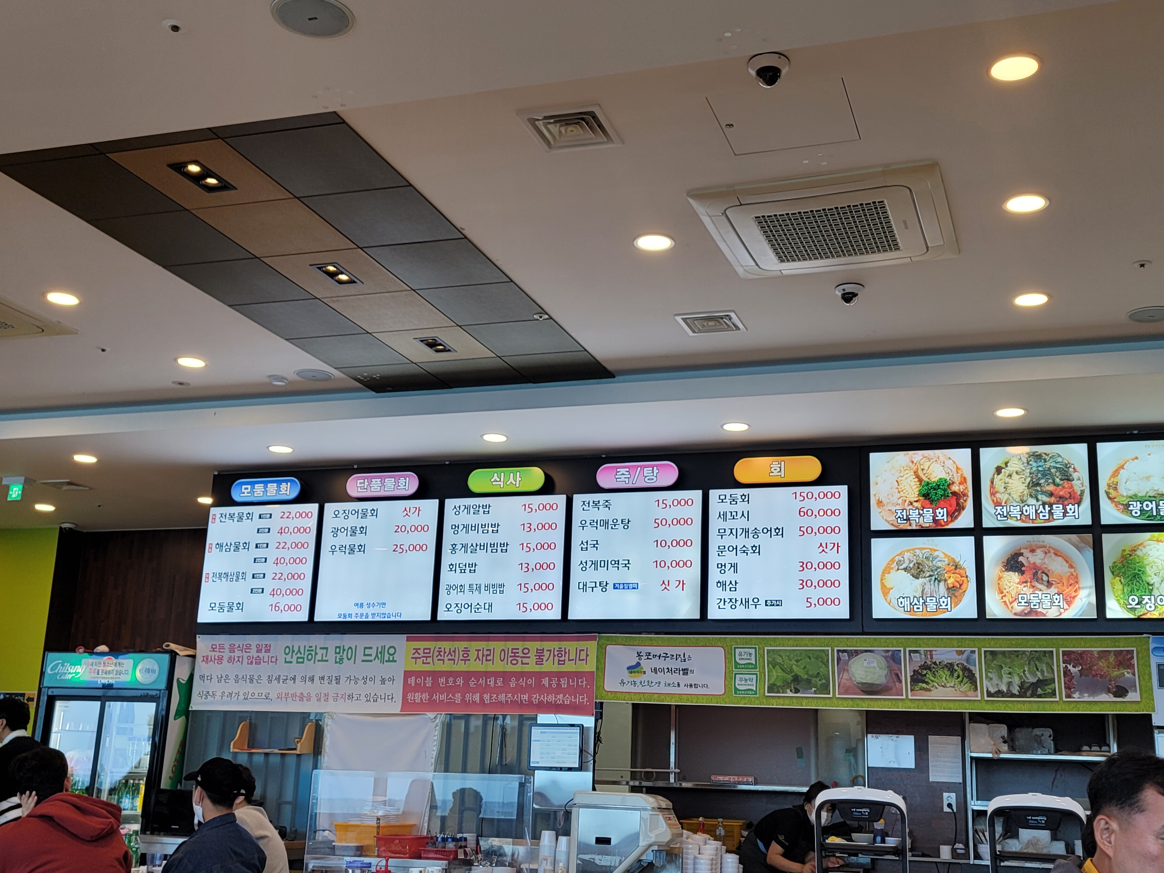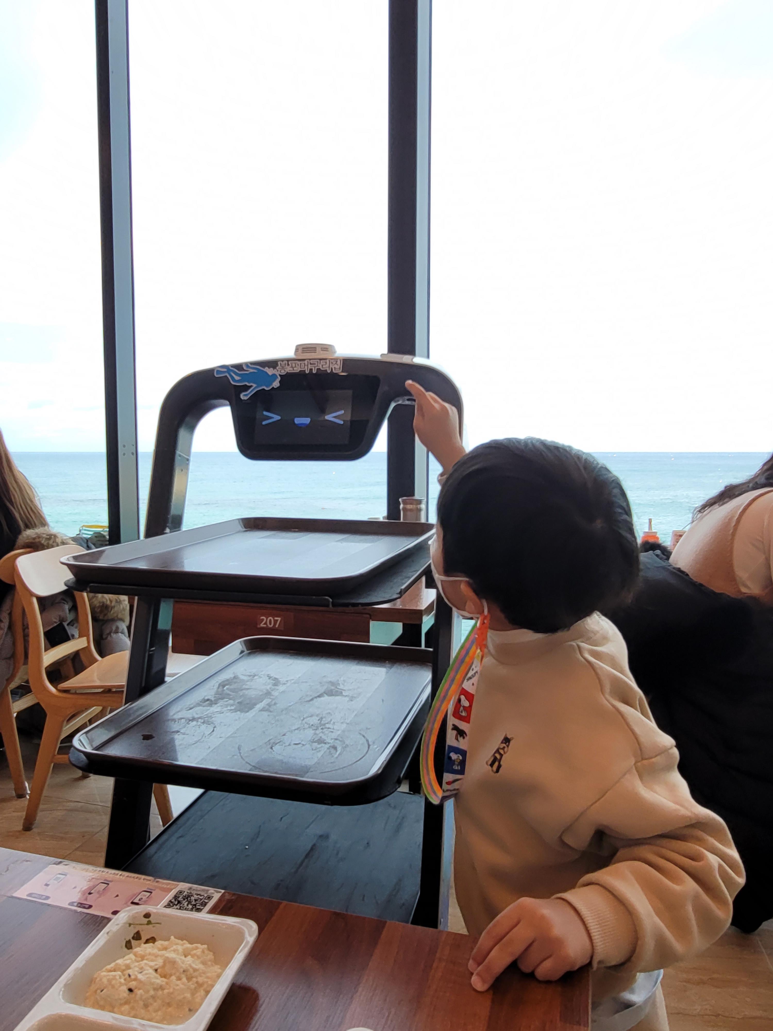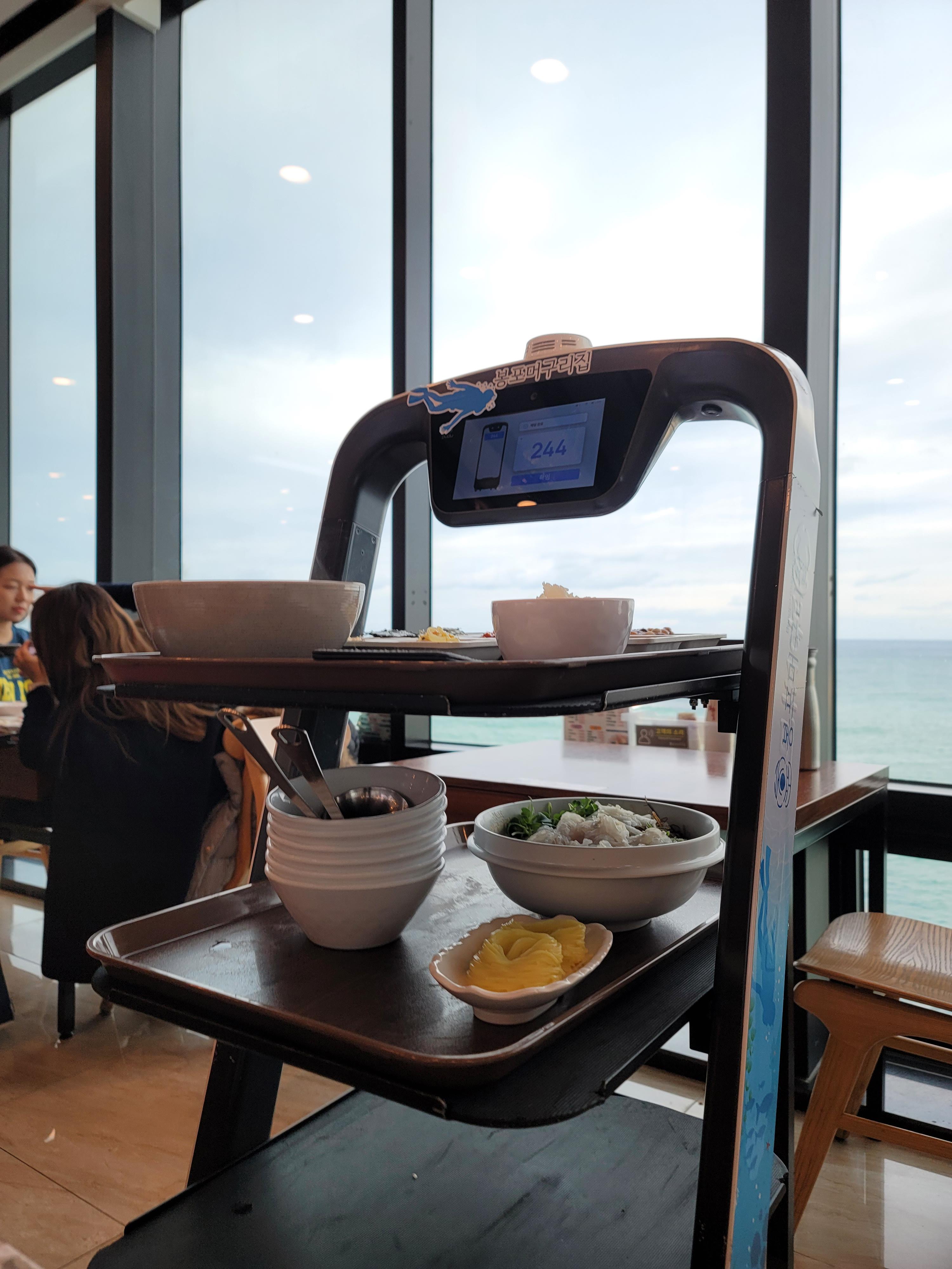 메뉴는 핸드폰 QR코드를 통해 직접 주문하시면 로보트가 서빙을 해줍니다. 물론 어려우신 분들은 사람 직원(?)에게 직접 주문을 하셔도 됩니다. QR코드로 주문을 하고 기다리시면 로보트가 메뉴를 들고오고요. 다 내린 후에 OK를 누르시면 다시 제자리로 돌아갑니다. 저희는 전복물회와 홍게살비빔밥을 주문해보았습니다.
