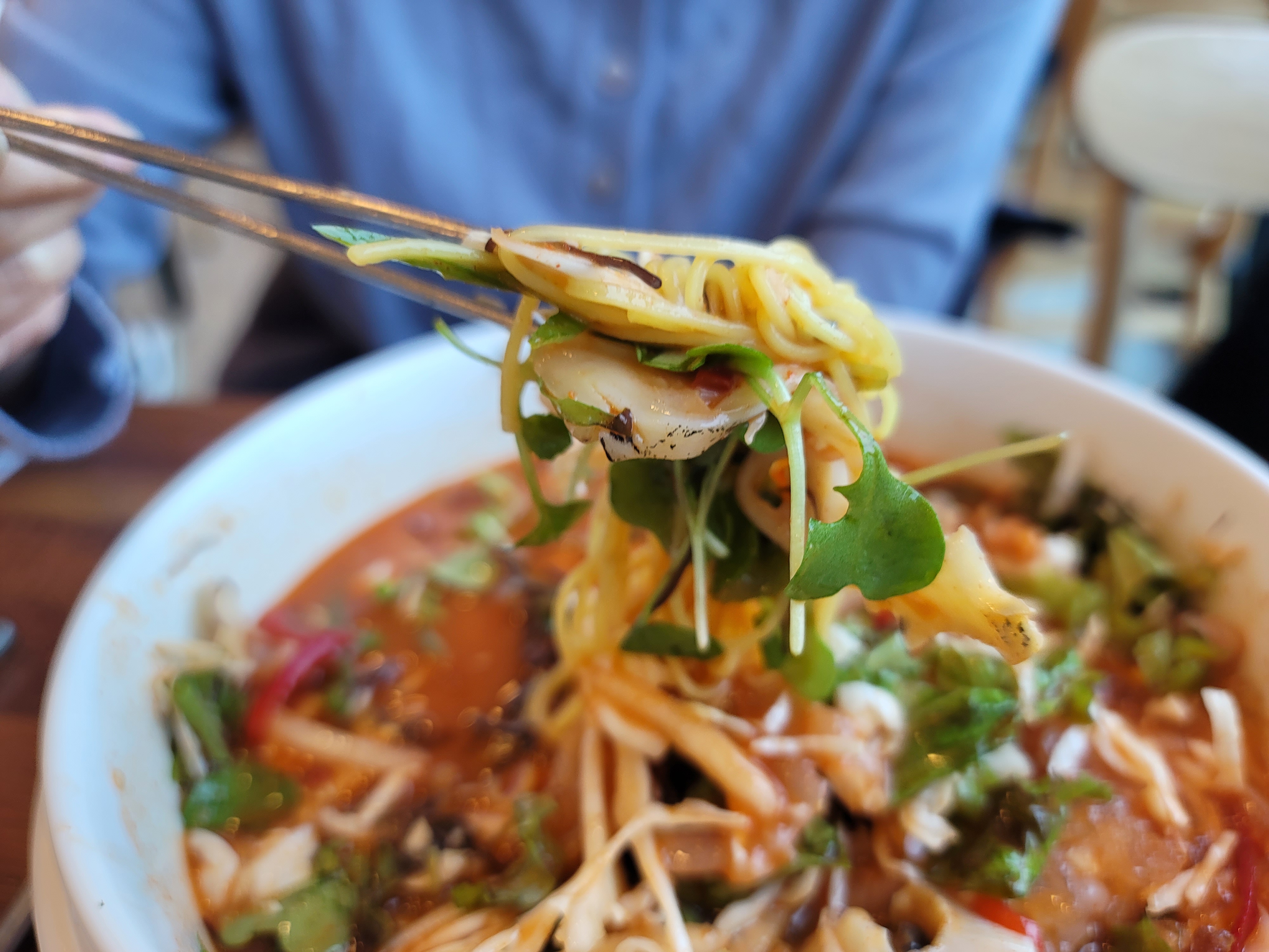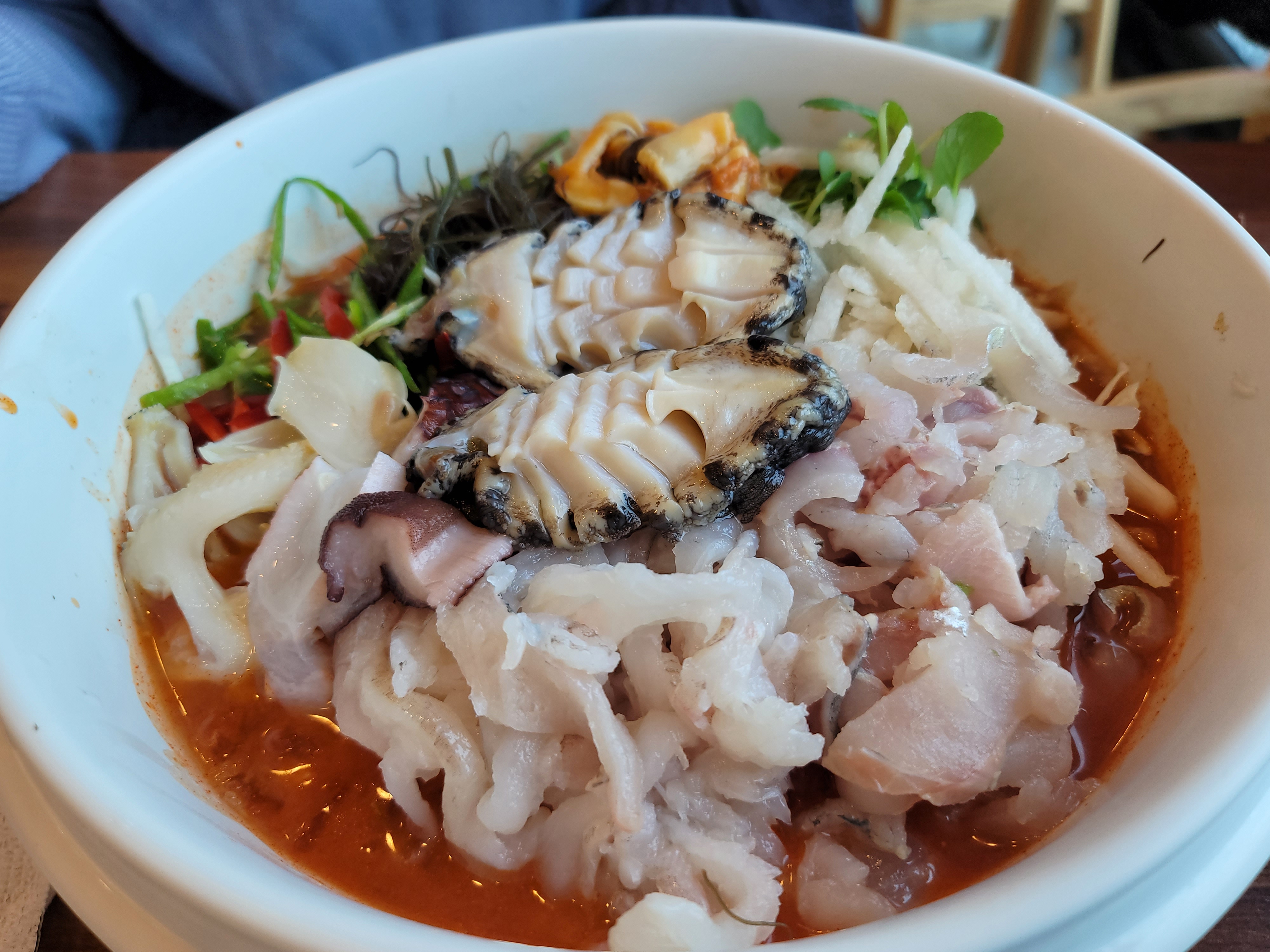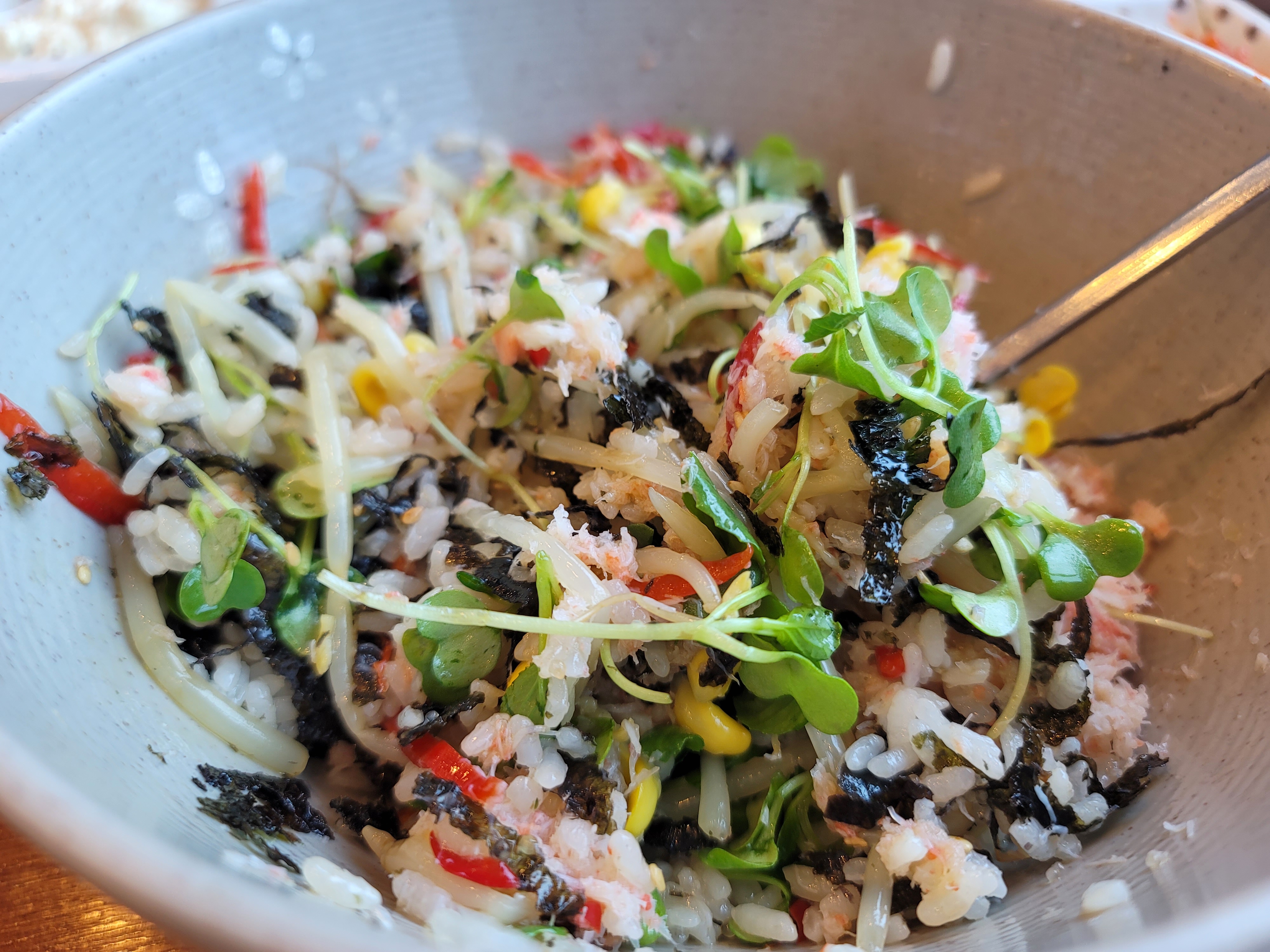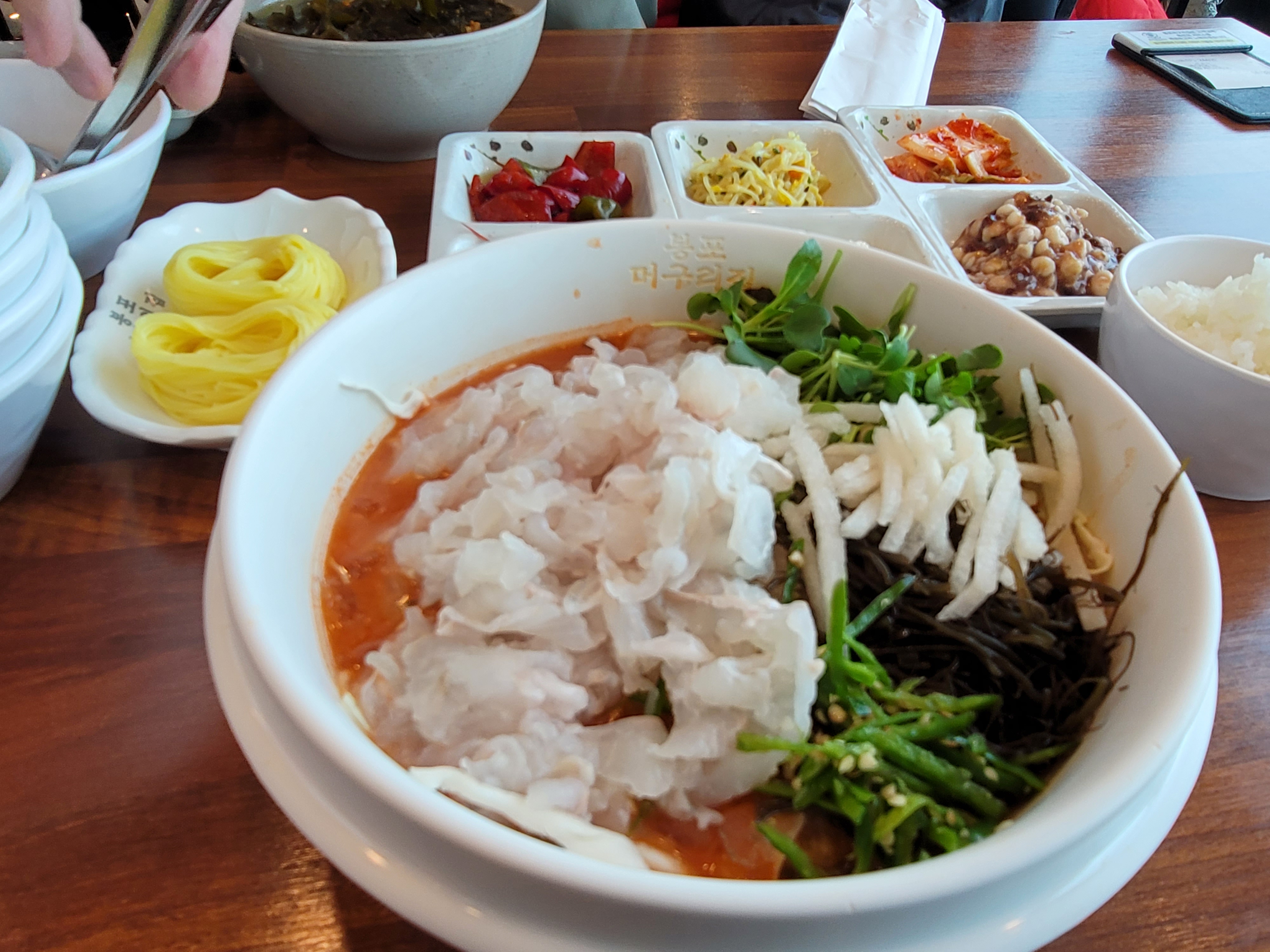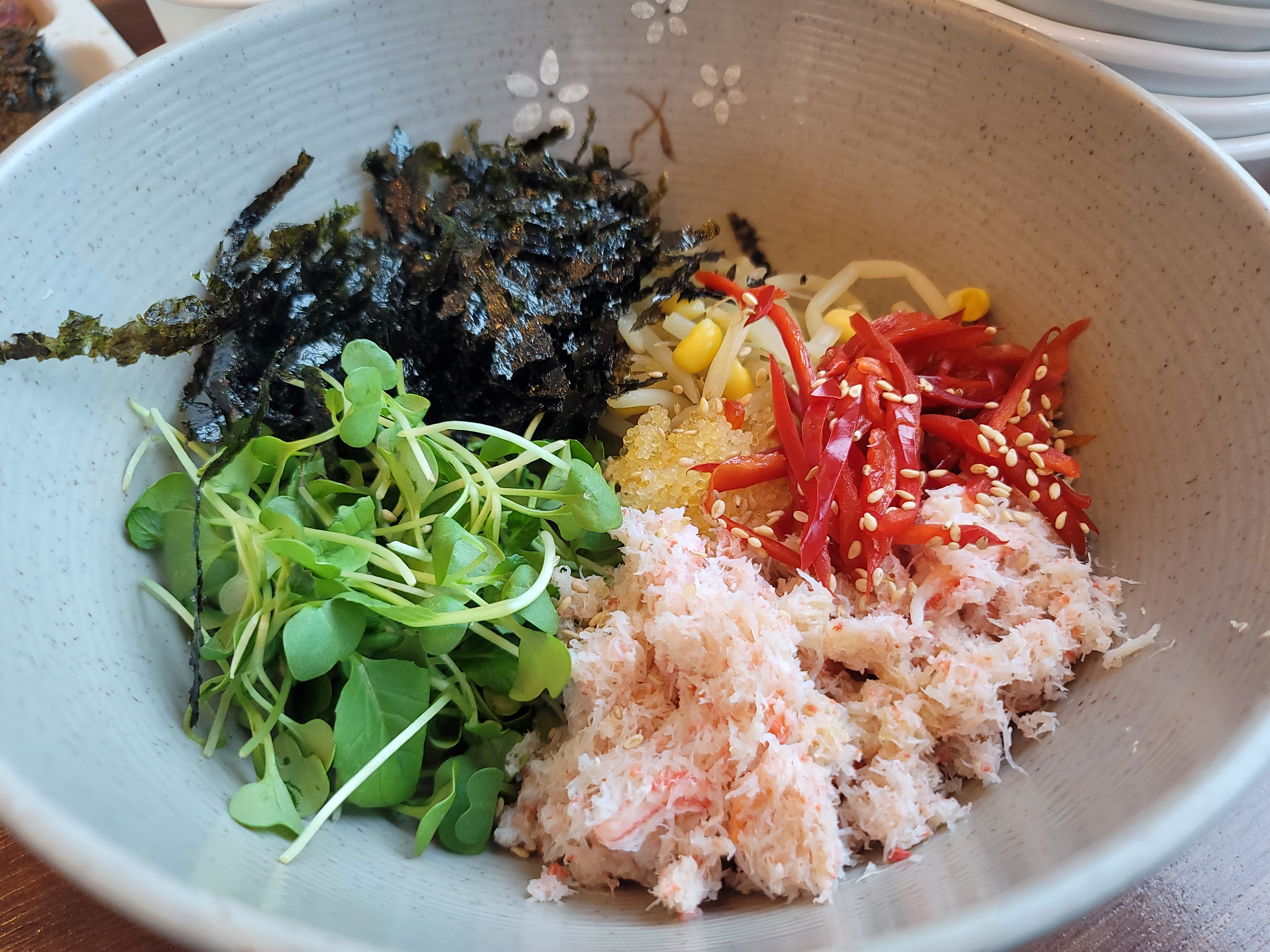 드디어 나온 전복물회와 홍게살비빔밥입니다. 물회는 아이가 먹기 어려워서 홍게살 비빔밥도 주문했는데요. 뭐가 됐든 맛있습니다. 전복물회는 오독오독 씹히는 맛과 물회 국물의 시원함이 아주 잘 맞는데요. 물회는 국물맛이 중요한데 국물이 아주 끝내줍니다. 국수 착착 말아서 먹으면 기가 막힙니다. 홍게살 비빔밥도 신선한 야채와 함께 홍게살이 듬뿍 들어 있는데요. 아이들이 먹기에 매우 좋답니다.