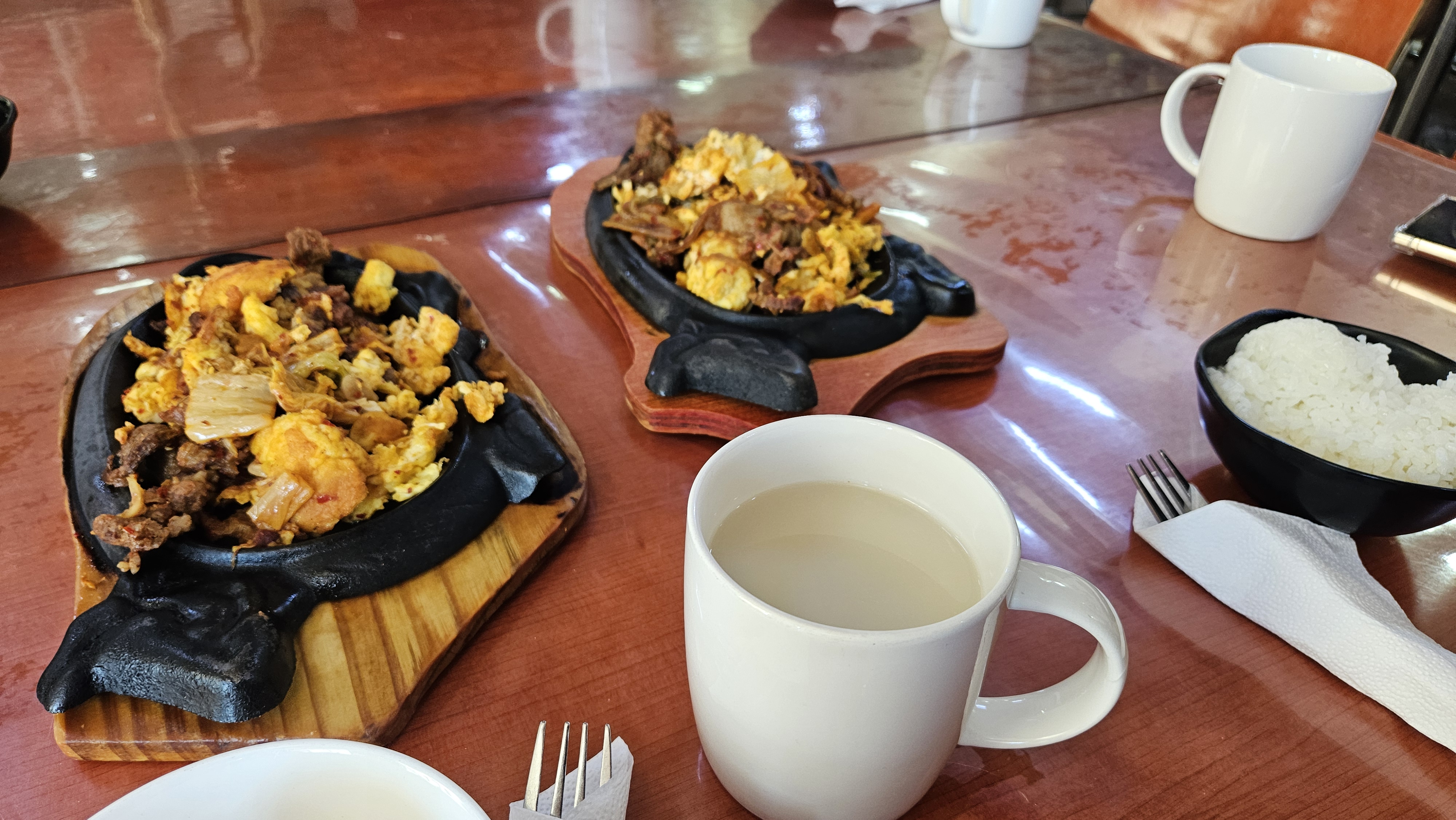 울란바토르 칭기스칸 국제공항에 차강소브라가까지는 약 6시간 가량 이동해야 합니다. 가는 길에 현지 식당에 들러서 첫 점심을 먹었습니다. 한국의 제육볶음 느낌의 요리와 말 우유로 시작했습니다. 제육볶음은 몽골에서 흔히 볼 수 있는 '후르가'로 고기, 계란, 야채를 볶아서 만드는 요리입니다. 그리고 함께 나온 '수테 차이'는 우유와 차를 함께 끓여 만든 몽골 전통 밀크티인데 이게 또 별미입니다. 첫 식사는 한국 느낌 물씬 나는 메뉴로 시작하며 기분 좋게 시작했습니다.