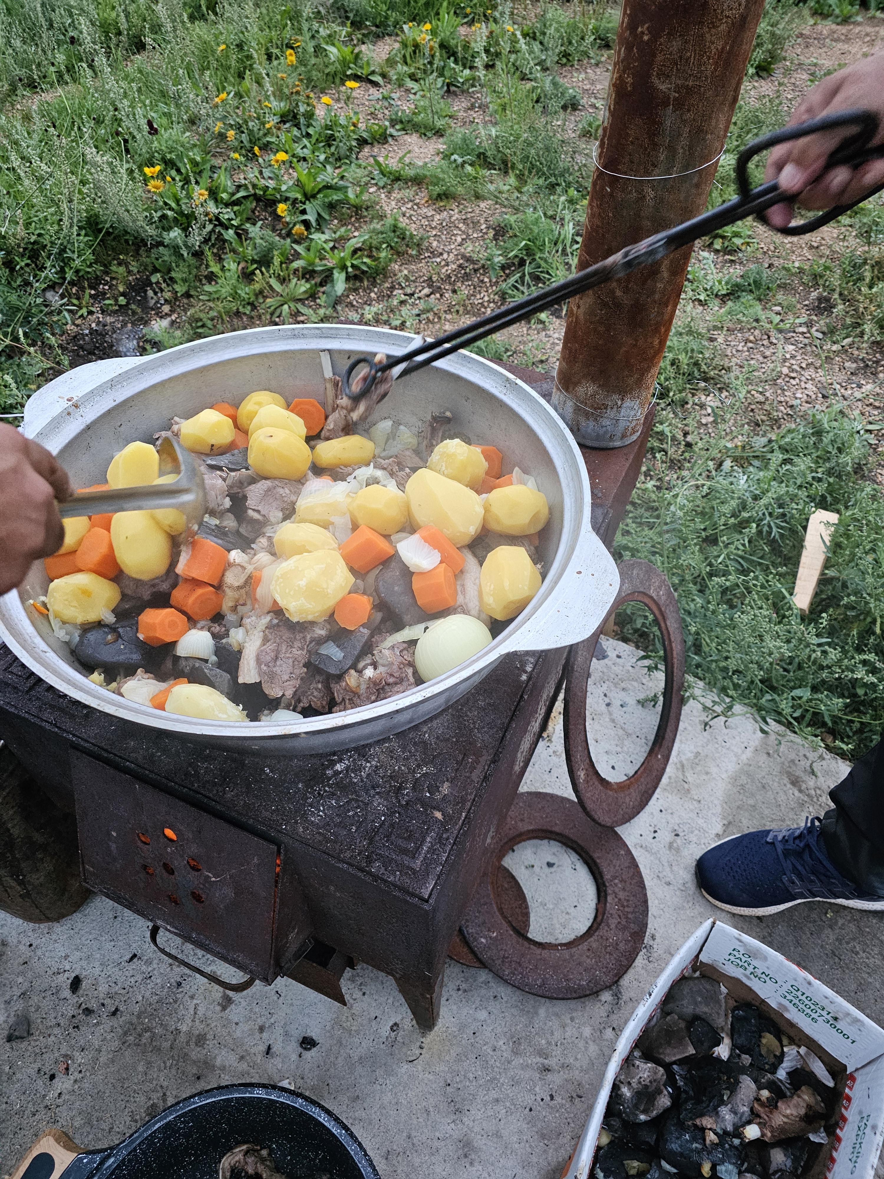 모든 관광을 마치고 마지막 게르에 도착했습니다. 기사님이 직접 만드는 허르헉이 저녁이었습니다. 허르헉은 몽골 전통 양고기 요리로 무조건 한번은 맛보고 와야 몽골 여행을 했다고 얘기할 수 있는 요리죠. 뜨겁게 달군 돌을 이용해 고기와 채소를 찌듯이 익히는 방식으로 만듭니다. 야외에서 특별한 날에 즐기는 전통 바비큐 요리입니다. 숯불에 직접 굽지 않고 돌과 수증기의 열로 고기를 익혀 먹는 방식이 우리나라 찜 요리와 비슷합니다. 맛은! 직접 드셔보시길!